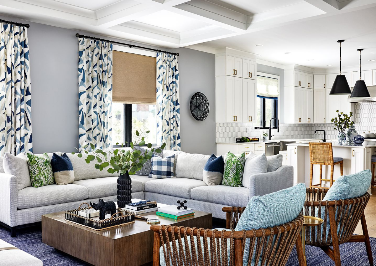 The kitchen opens up to a wild and worldly living room. The patterned draperies jump out at you first, then the fabulous armchairs with rope detail, and then all the smaller elements that tie the design together, like the throw pillows and cocktail table accessories. Since this is where our clients would rest after work or entertain family and friends, we chose a green and blue color palette for a relaxing, sophisticated, and social atmosphere.