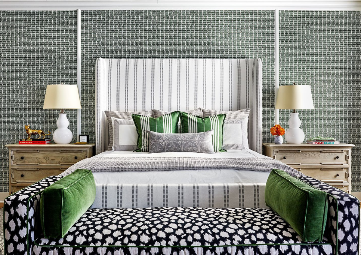 We wanted our clients’ master bedroom to be soothing, uplifting, personal, and restorative. As you know, color and texture is our zone of genius. We combined natural textures, neutral tones, shades of emerald green and orangey-red. The textured grasscloth wallpaper (CHANNELS IN EMERALD BY THIBAUT) is the perfect backdrop for this space.