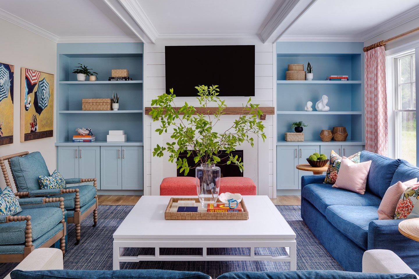 A bold, primarily cool color palette, coastal artwork, and casual furnishings are a few of the common denominators in these two separate living rooms at our Spartina Cove Project.